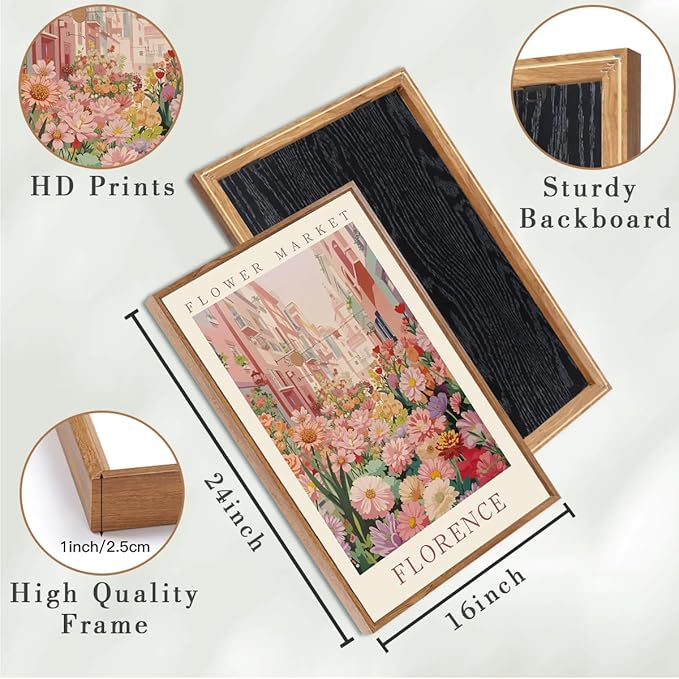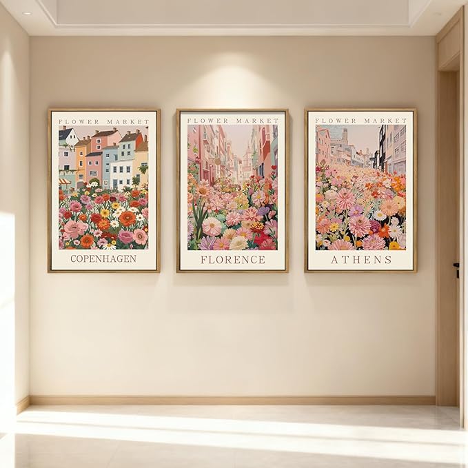 - 【Framed Pink Matisse Wall Art】 Measuring 16 x 24 inches, approximately 40 x 60 cm, is framed and equipped with backing board on the back of the canvas. Framed pink travel city artworks feature vibrant, whimsical scenes of Copenhagen, Florence, and Athens. Bright blooms, pastel - hued architecture, and the “FLOWER MARKET” motif capture the romance of iconic cities, instantly elevating your decor.