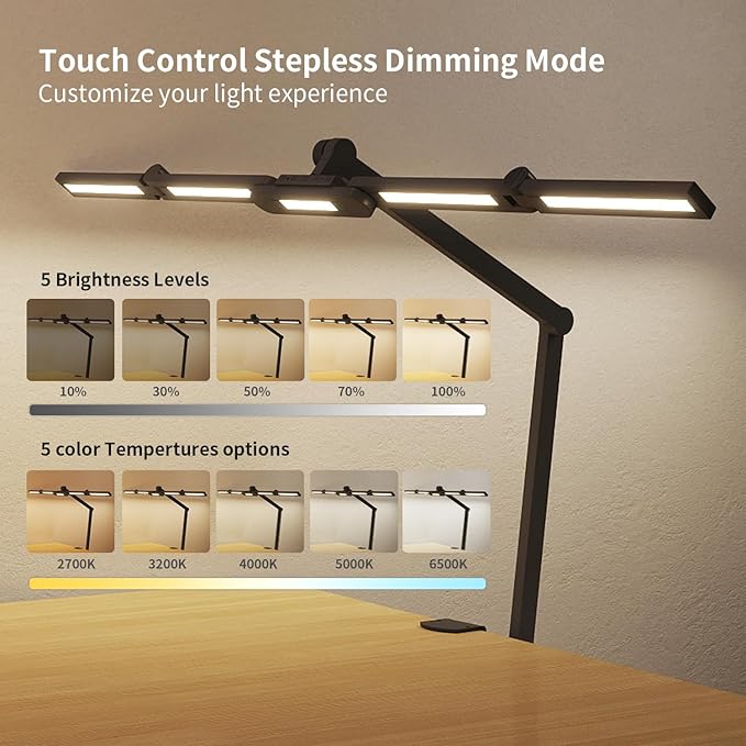 - 【Multiple Lighting Combinations】: Lincrealy office desk lamp provides a wide range of brightness adjustment, including multiple color settings across a white-and-yellow spectrum. You can click the touch panel to adjust the 5 levels of brightness and color temperatures step by step, or you can long press the panel for stepless dimming (20% - 100%) and stepless tempering (3000K - 6000K). The memory function will restore your last setting.